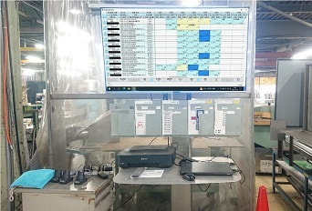 受注から製造指示、製品出荷までバーコードを駆使した管理体制のもと、現場にて各製品の製作状況が把握できるように大型ディスプレを設置、これにより作業員が進捗状況を確認でき納期管理に結びつけています。[富士宮工場]